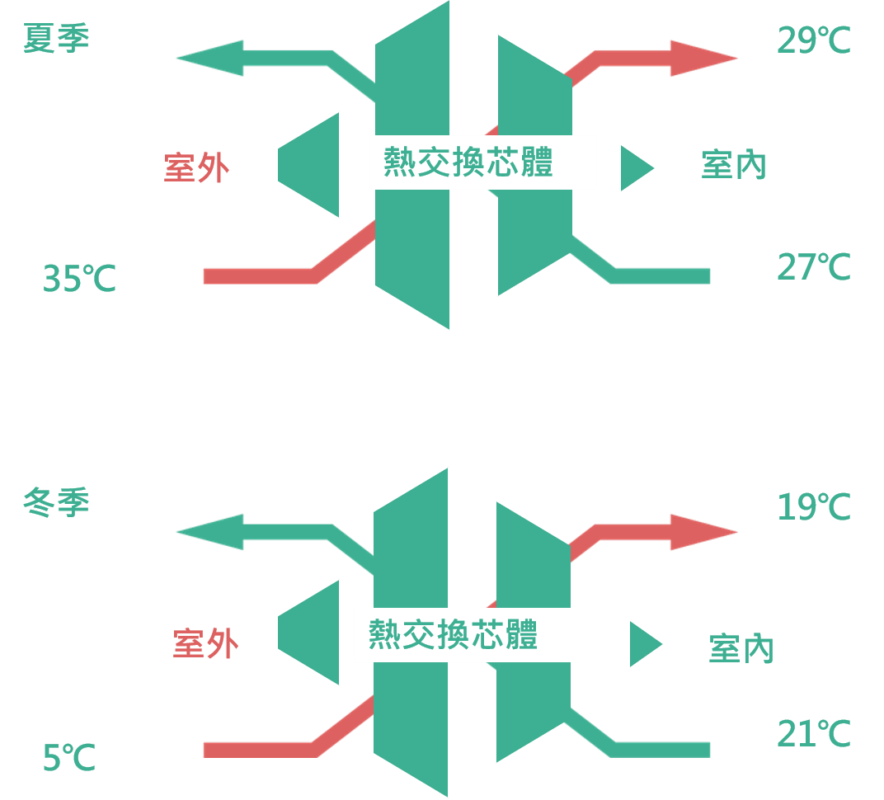 全熱交換機的運作原理主要是透過熱交換濾芯,平衡室外與室內的空氣溫度,讓換氣的過程不會產生太大的溫度變化,維持室溫在舒適的範圍,除了能夠提供更好的居住品質,也能避免溫度變化頻繁導致不必要的空調耗能。