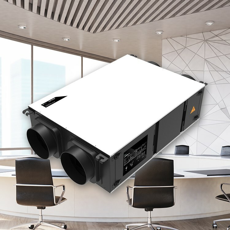 長期使用空調的空間,因為門窗緊閉,空氣對流不佳,經常會有二氧化碳濃度過高的問題,建議搭配全熱交換器使用,不但能改善空氣對流,全熱交換器的熱交換功能也可以減少空調的耗能。